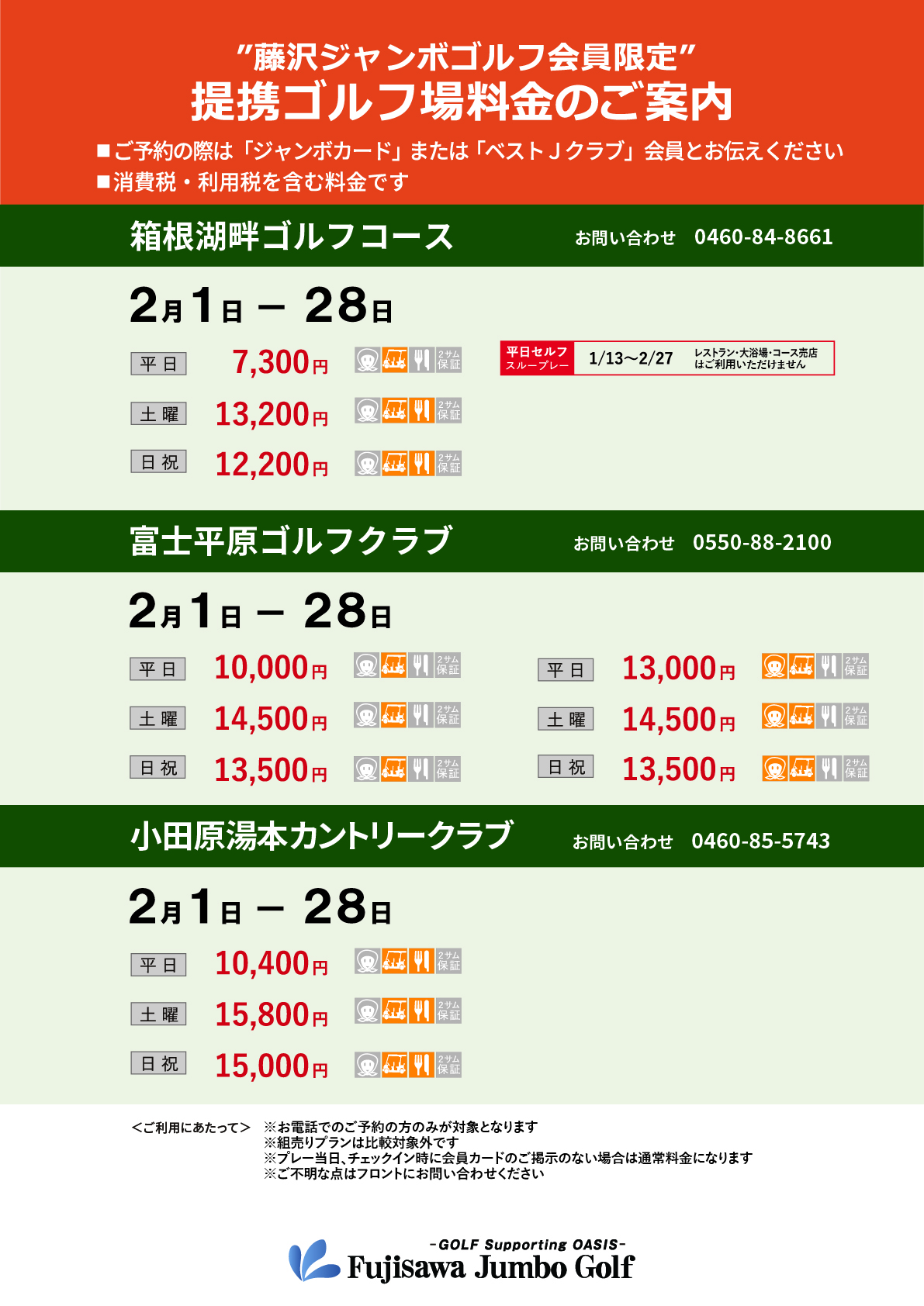 【藤沢ジャンボゴルフ会員 提携ゴルフ場料金(2月)】のご案内