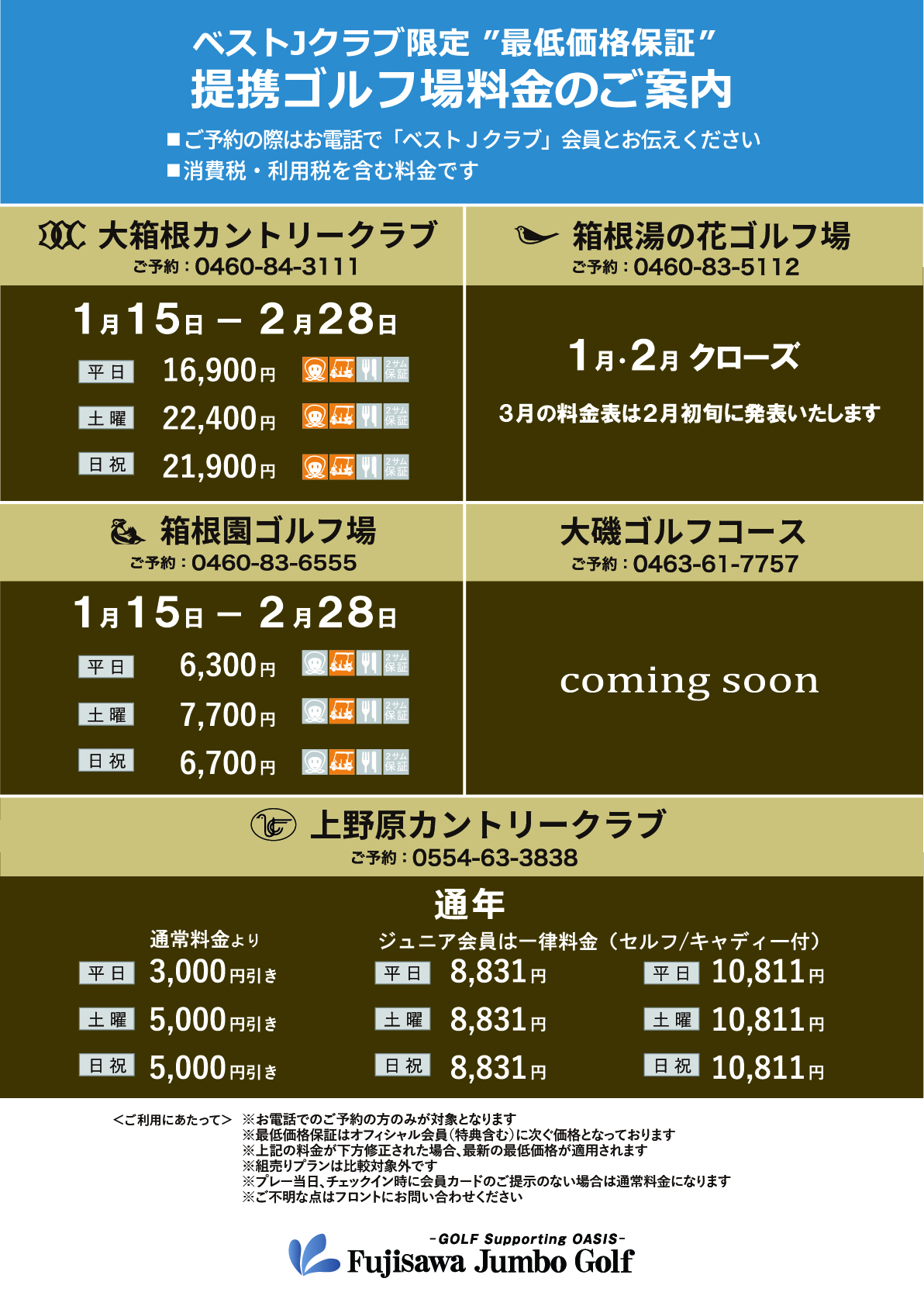 既にご利用いただいております上野原カントリークラブと同様に、“最低価格保証”付きのプレー費となります。